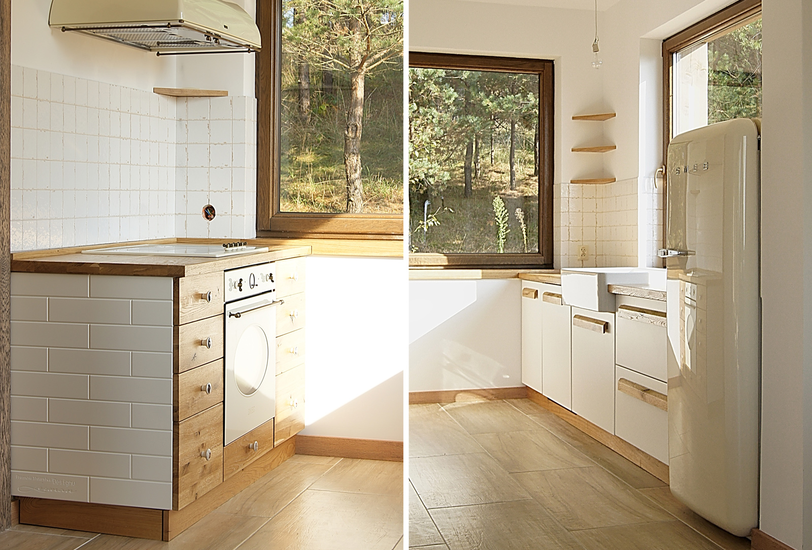 Meble na wymiar w jasnym stylu. Blat, cokoły i uchwyty z litego drewna. Fronty drewniane lub lakierowane.