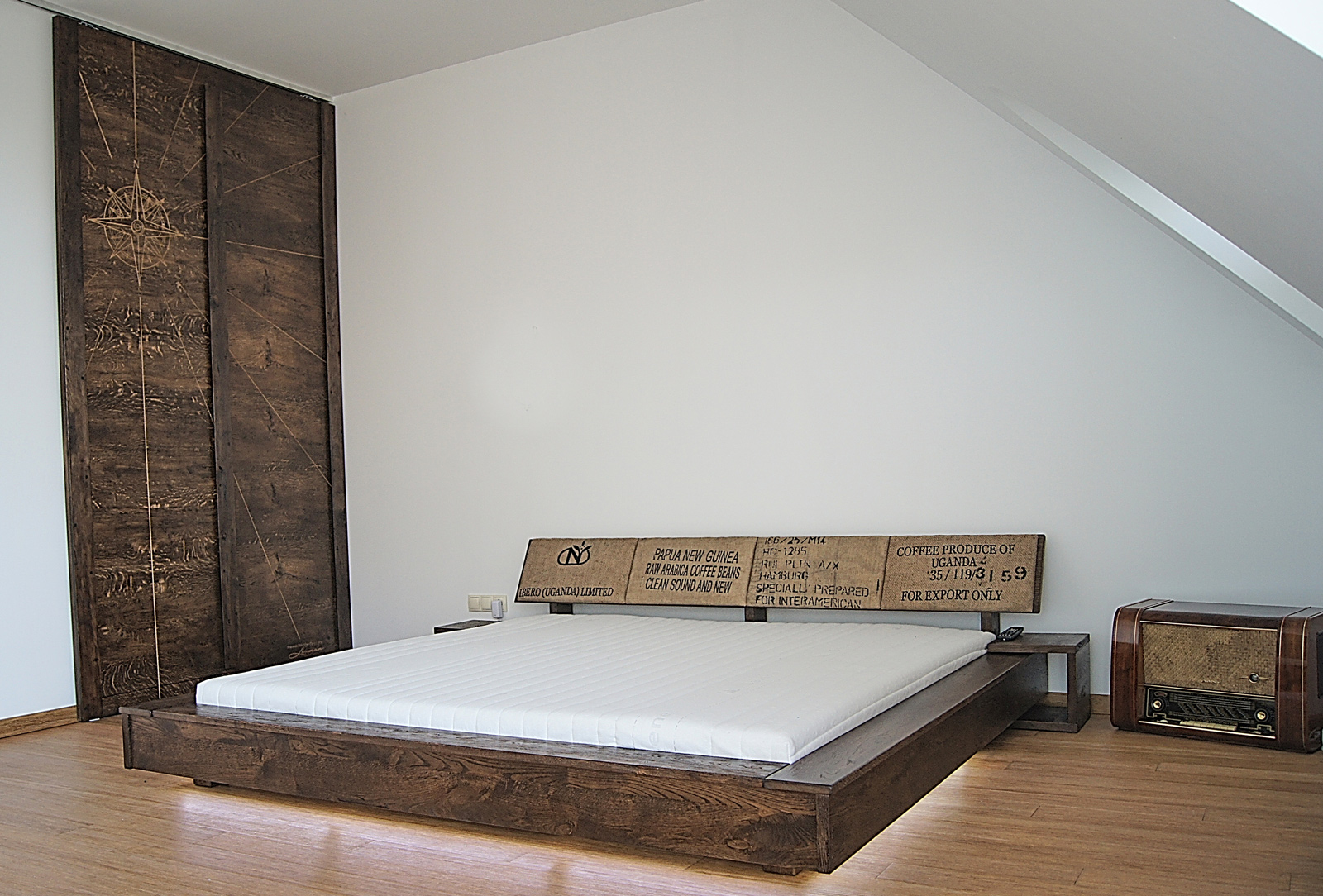 Łóżko z podświetleniem sprawiającym efekt unoszenia się w powietrzu. Drzwi pod zabudowę z grawerem.